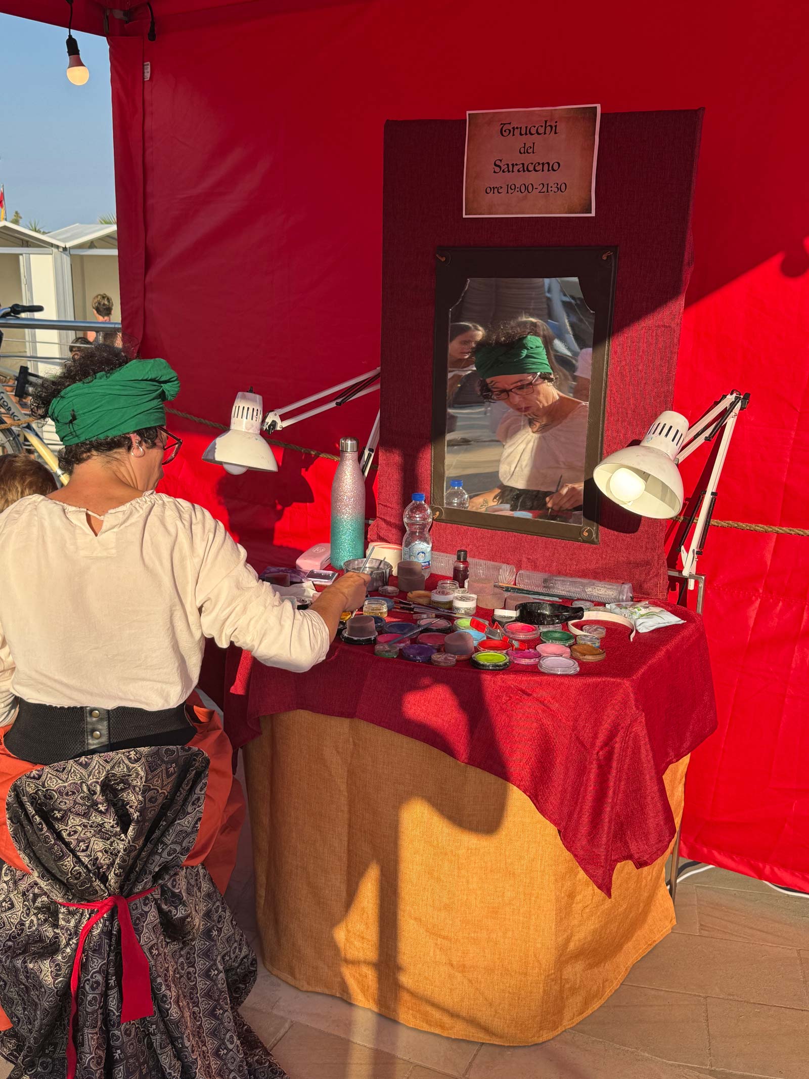 Tra le vie e gli spazi dell’evento si incontrano artisti itineranti che animano la serata con sorprese continue. Il Mercante Orientale, con il suo carro in legno, affascina grandi e piccoli mostrando curiosità esotiche e proponendo numeri di magia, illusionismo e fachirismo. I Saraceni sui trampoli dominano la scena con la loro imponenza, regalando suggestive coreografie dall’alto e creando un forte impatto visivo.